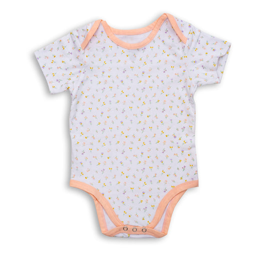 Soft short-sleeve baby onesie featuring a delicate pastel floral print on a white base.