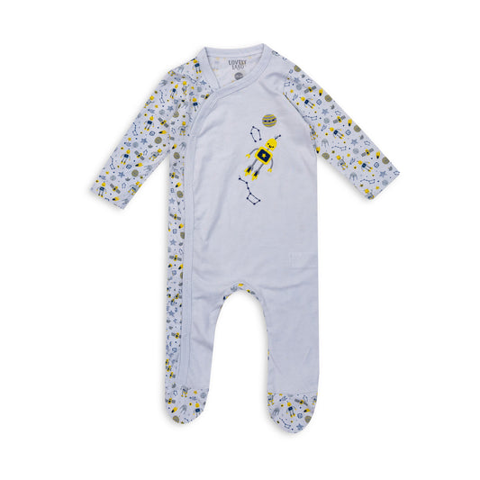 Soft baby footed sleepsuit with cute space print and easy snap closure.