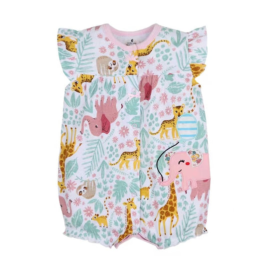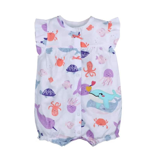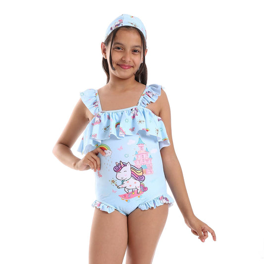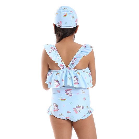 Unicorn Self Pattern Short Sleeves One-Piece Girls Swimsuit with Decorated Ruffles - Turquoise, Brown &...