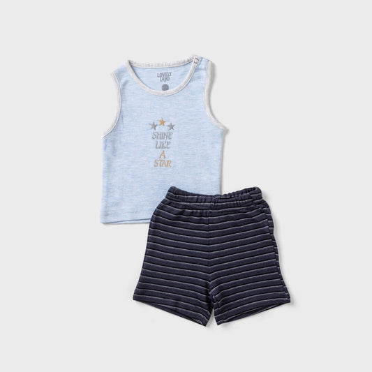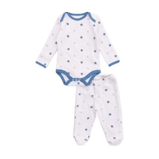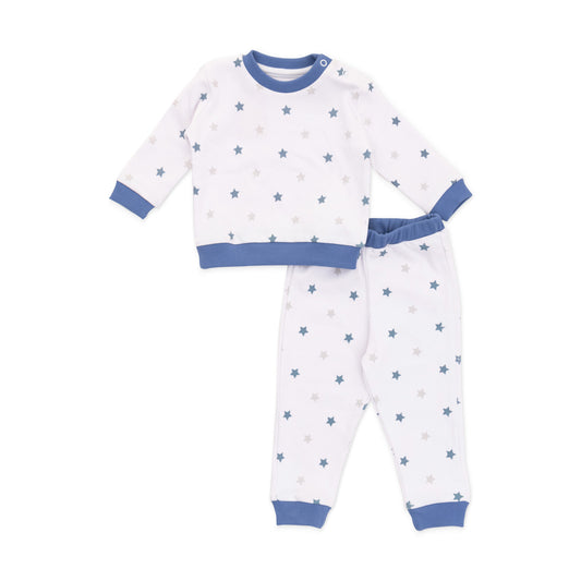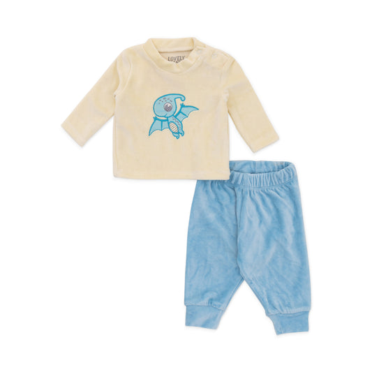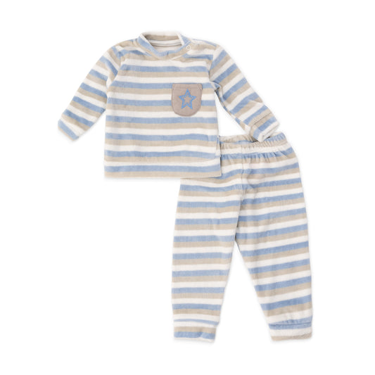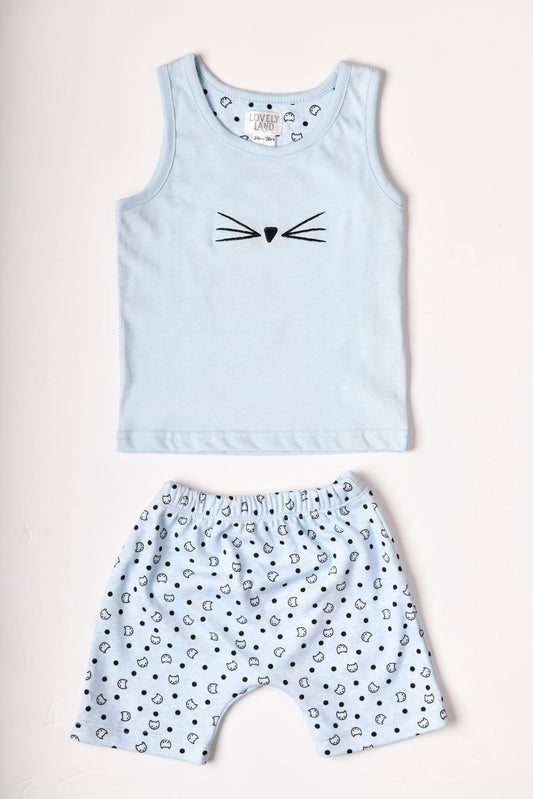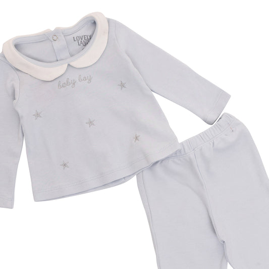 light blue pyjama shirt with chest stitching and light pantsÂÂ
