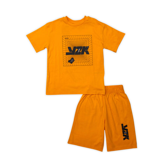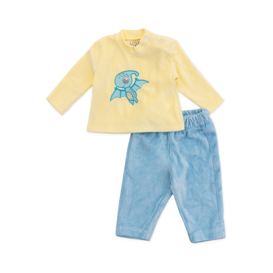 yellow pyjama shirt with chest stitching and blue pantsÂÂ