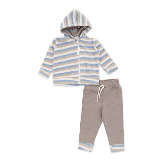 white and blue stripped hoodied jacket and grey pantsÂÂ