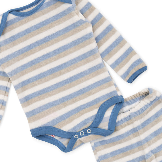 cream pyjama shirt with chest stitching and blue pantsÂÂ