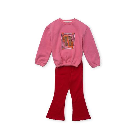 long sleeve fuchsia top with chest print and red pants