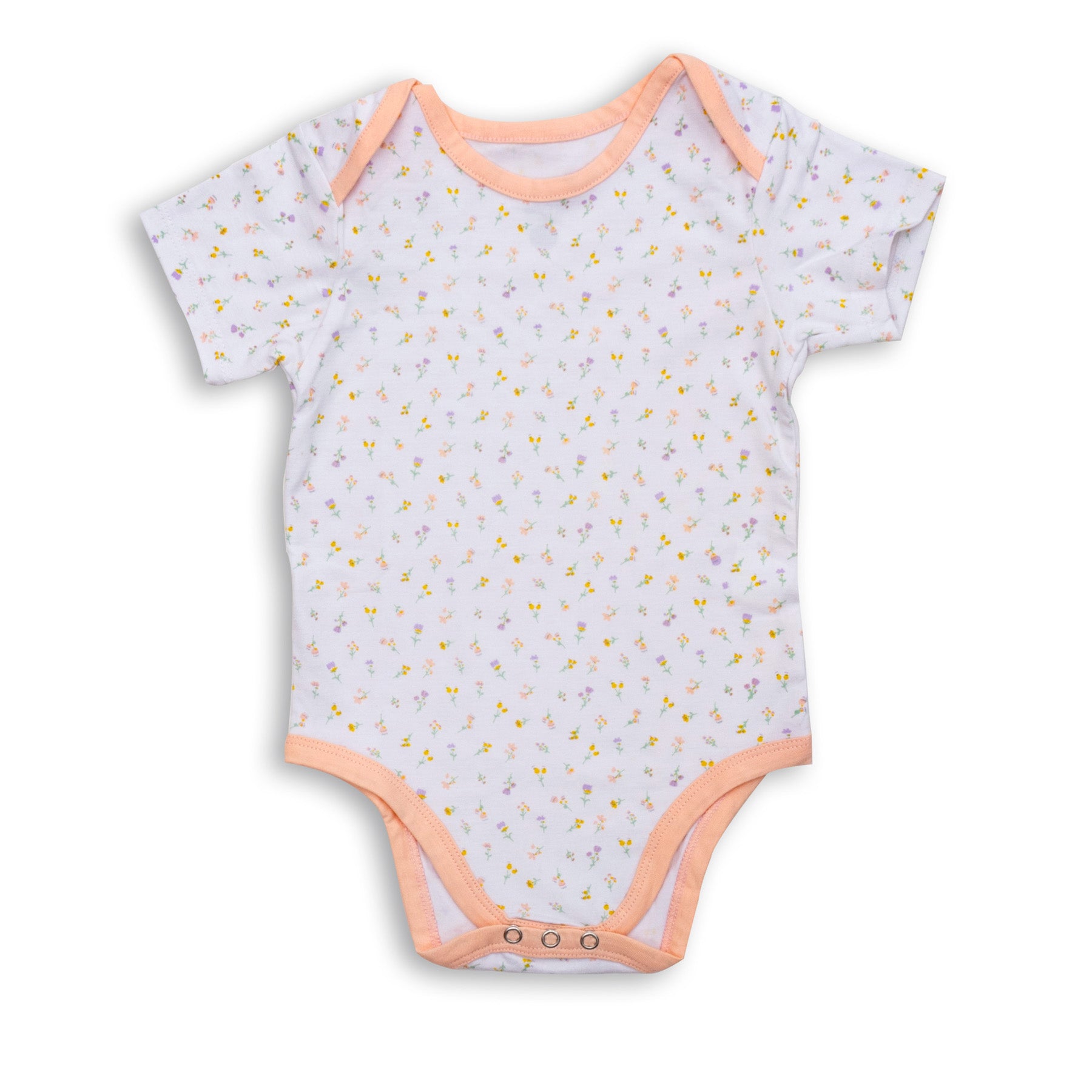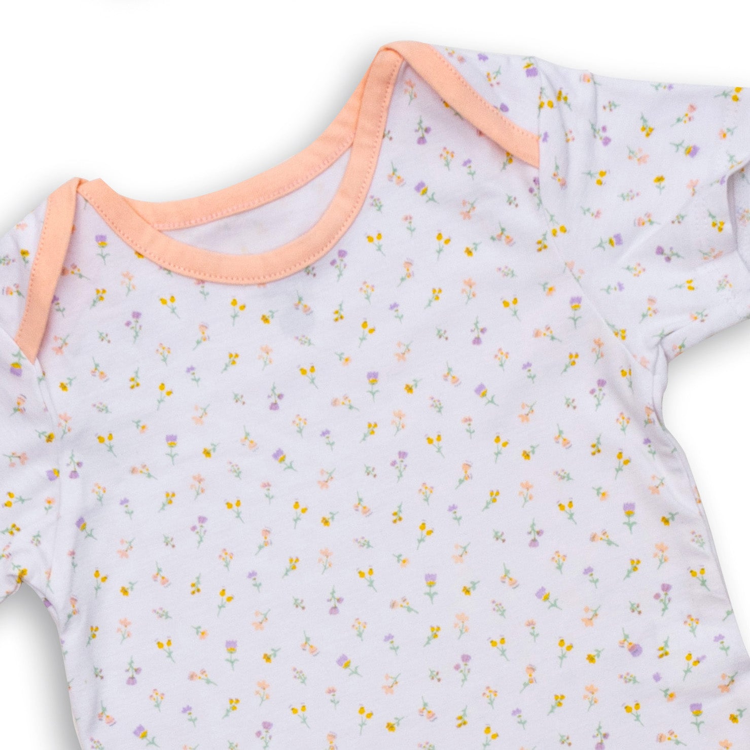 Soft short-sleeve baby onesie featuring a delicate pastel floral print on a white base.