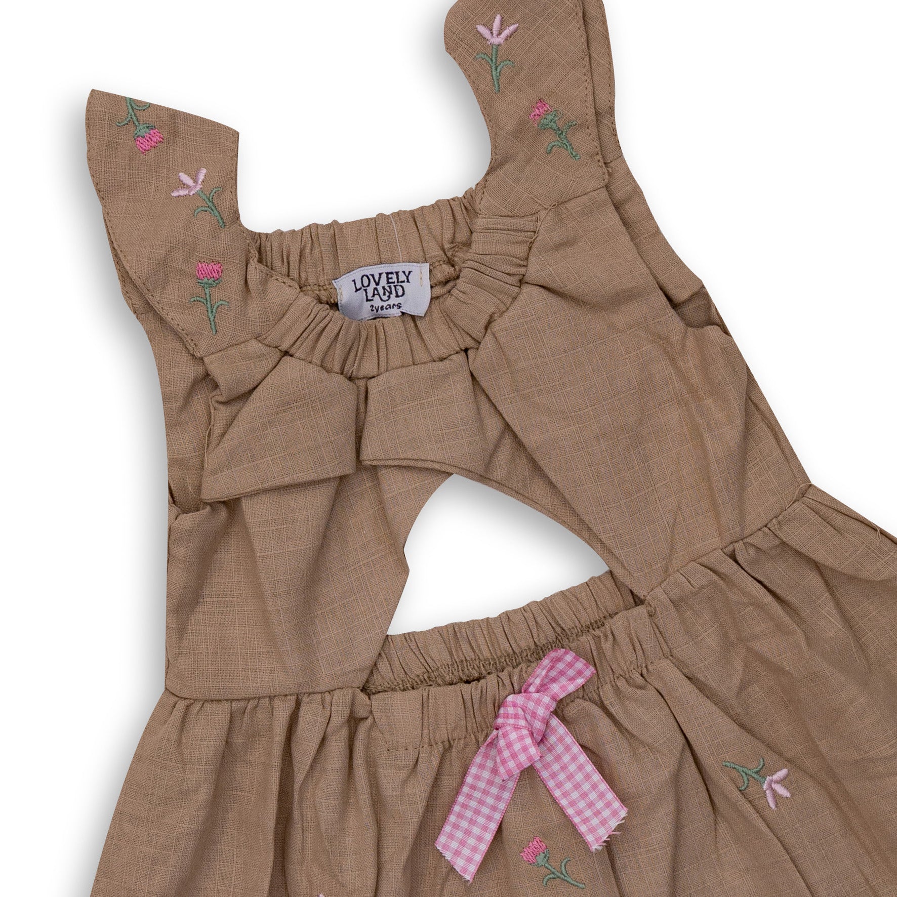 beige sleeveless dress with pink bowtie