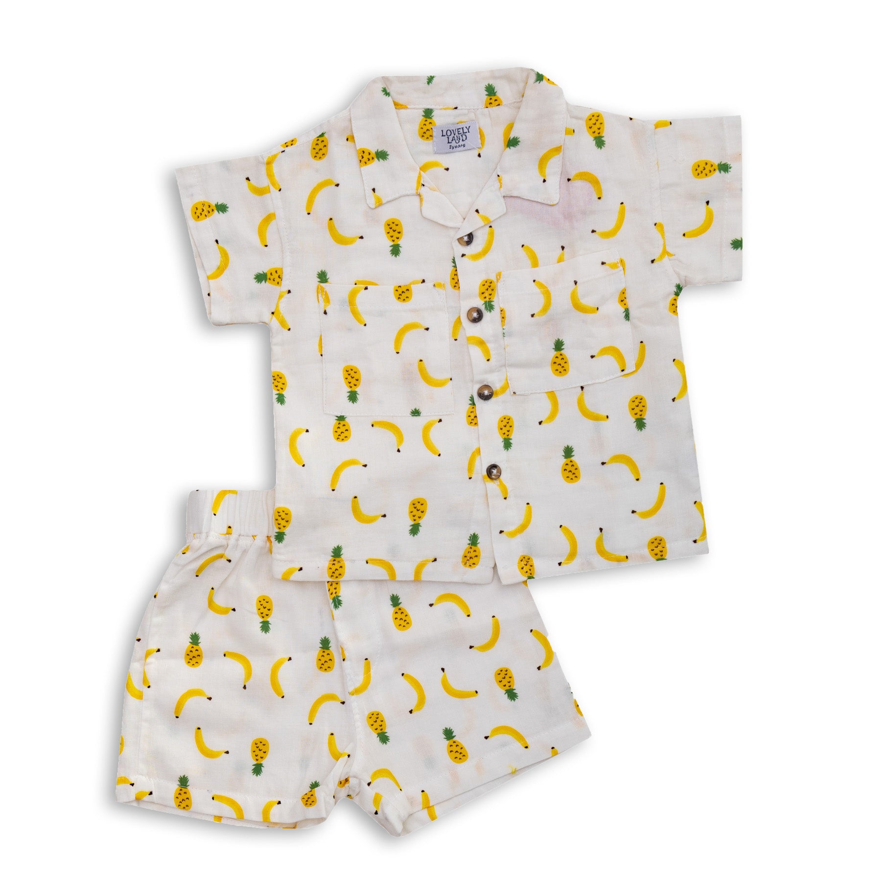 Soft cream pyjama set with fun all-over banana print, comfy shirt and shorts.