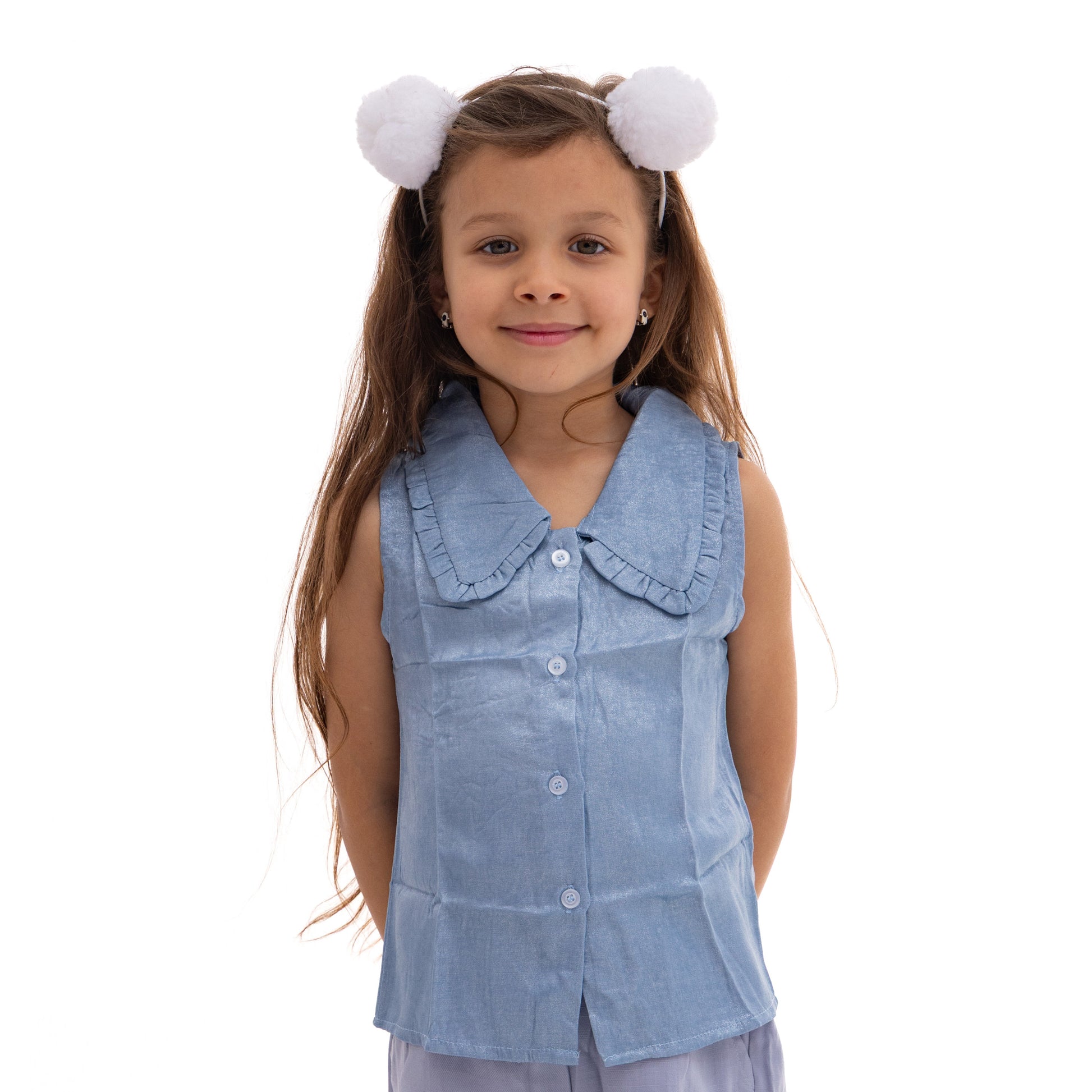 Cute light blue sleeveless blouse with front buttons and a ruffled collar.