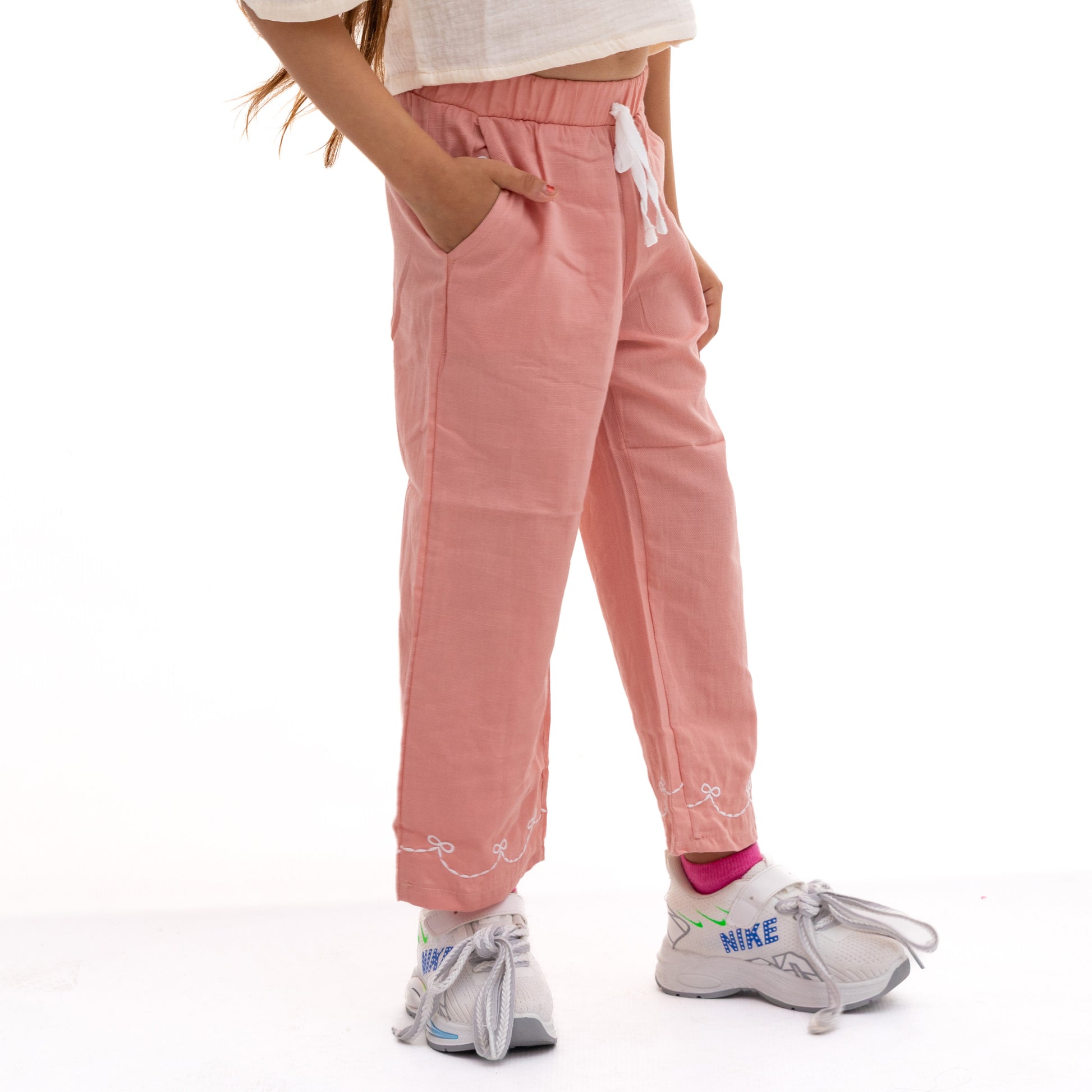 Pink pants with a bow on the leg