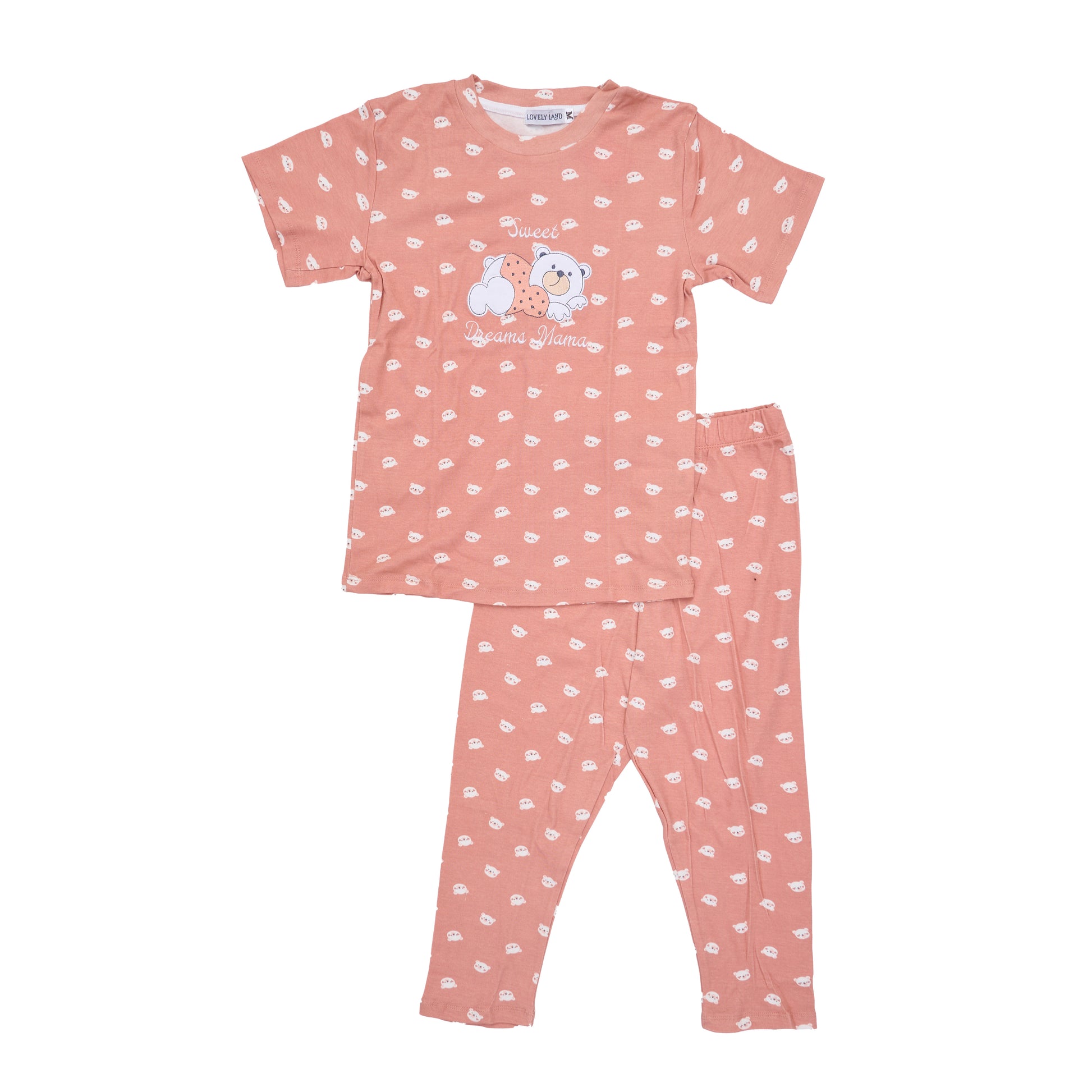 Cute women’s simon-colored pyjama set with a teddy bear print, comfy and perfect for bedtime.