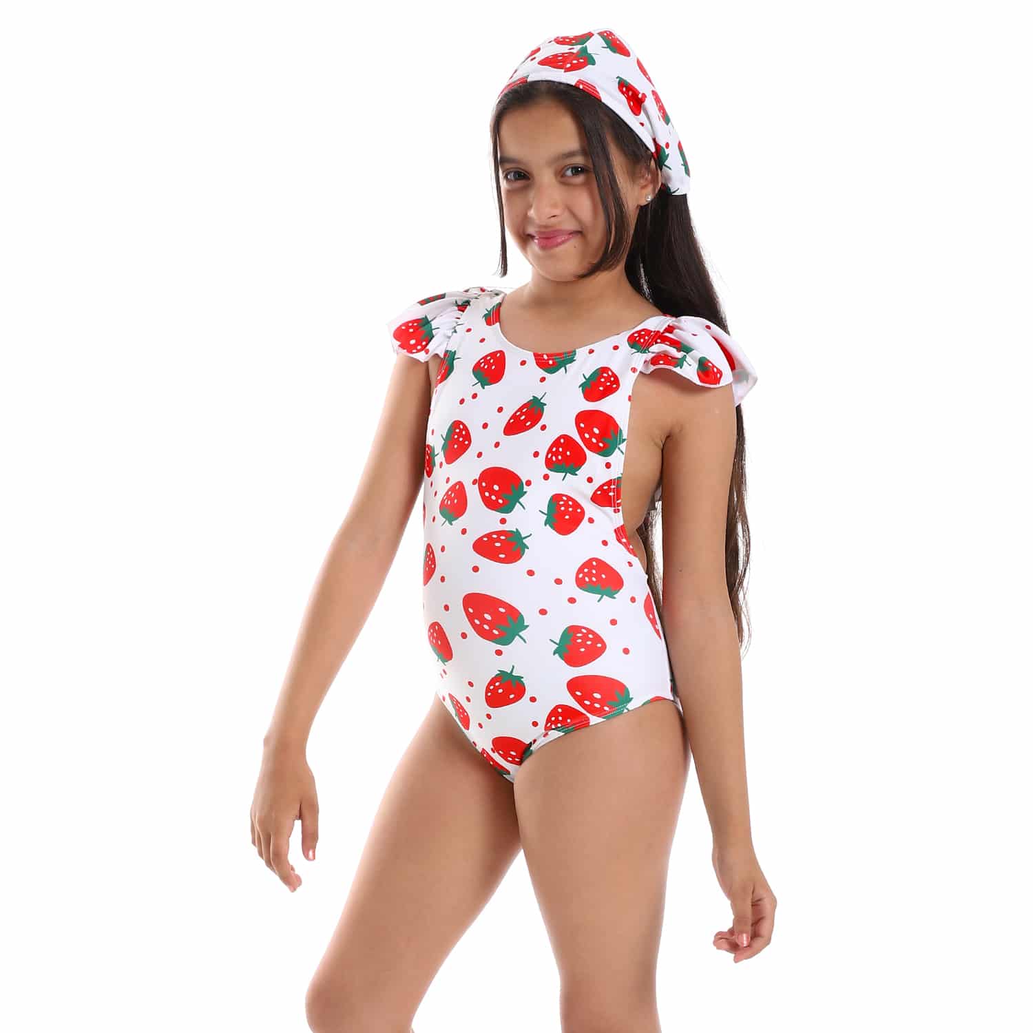 strawberries self pattern ruffle sleeves girls one piece swimsuit red white